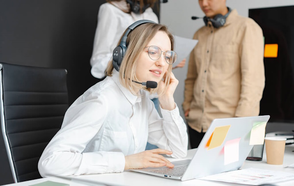 A professional, approachable receptionist or case manager answering a phone call in a welcoming office environment.
